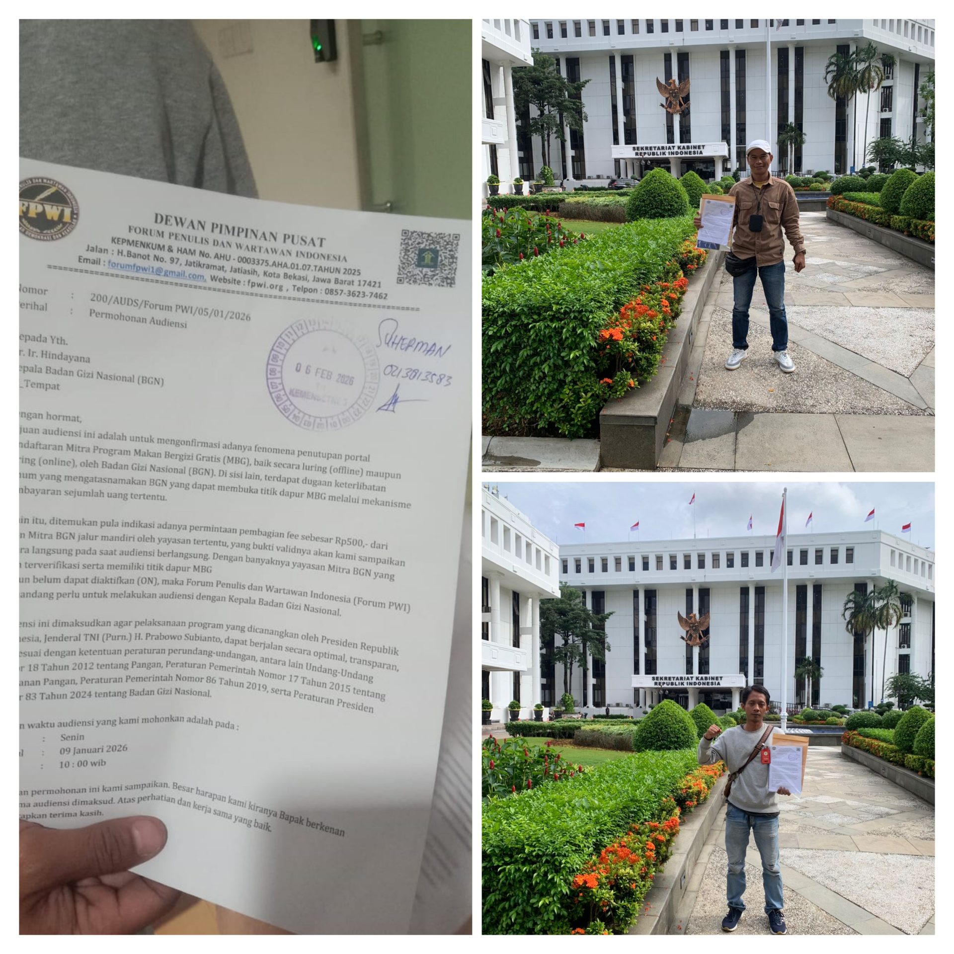 Permohonan tersebut disampaikan secara resmi melalui surat bernomor 200/AUDS/Forum PWI/05/02/2026 dengan pokok perihal permohonan audiensi guna mengonfirmasi sejumlah persoalan yang berkaitan dengan pelaksanaan Program Makan Bergizi Gratis (MBG).