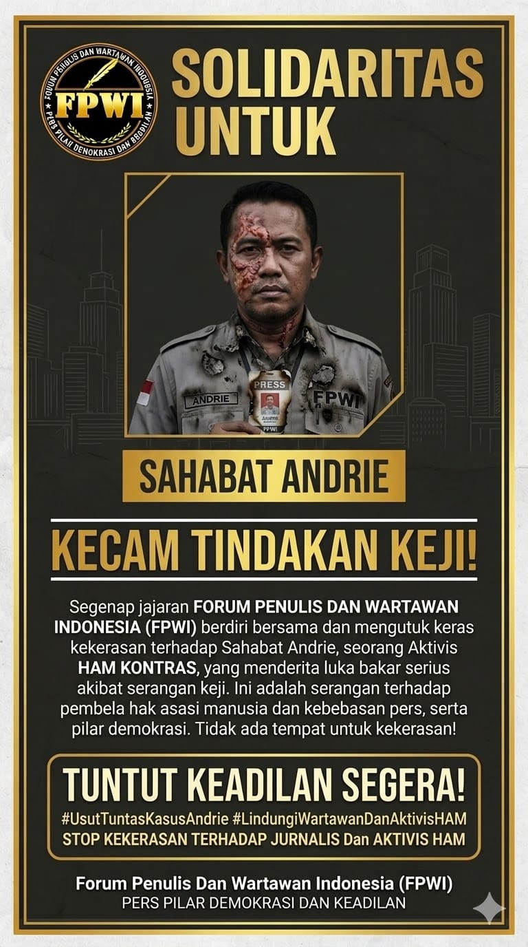MEDIA WARTA NASIONAL | JAKARTA’ Ketua Umum Forum Penulis dan Wartawan Indonesia (Forum PWI), Rukmana, S.Pd.I., C.PLA, mengecam keras penganiayaan terhadap Jurnalis dari media TV One, Frendy Primadana, di Bangka Belitung dan aksi penyiraman air keras yang menimpa seorang aktivis hak asasi manusia dari Komisi untuk Orang Hilang dan Korban Tindak Kekerasan (Kontras), Andre di Jakarta.