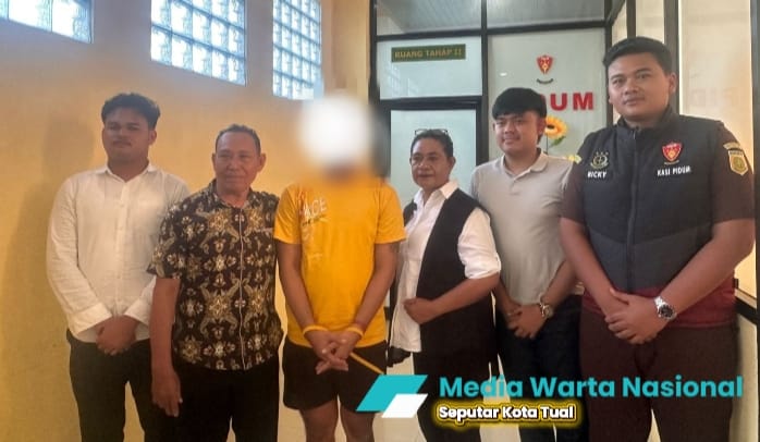 MEDIA WARTA NASIONAL | TUAL’ Anggota reskim polres Tual membawa dan menyerahkan pelaku kasus penganiayaan kematian siswa Madrasah Tsanawiyah (MTs) Maluku Tenggara (Malra) AT (14), eks brimob, Masias Siahaya ke kejaksaan Negeri Tual,,senin (30/3),pukul 15:10 WIT.