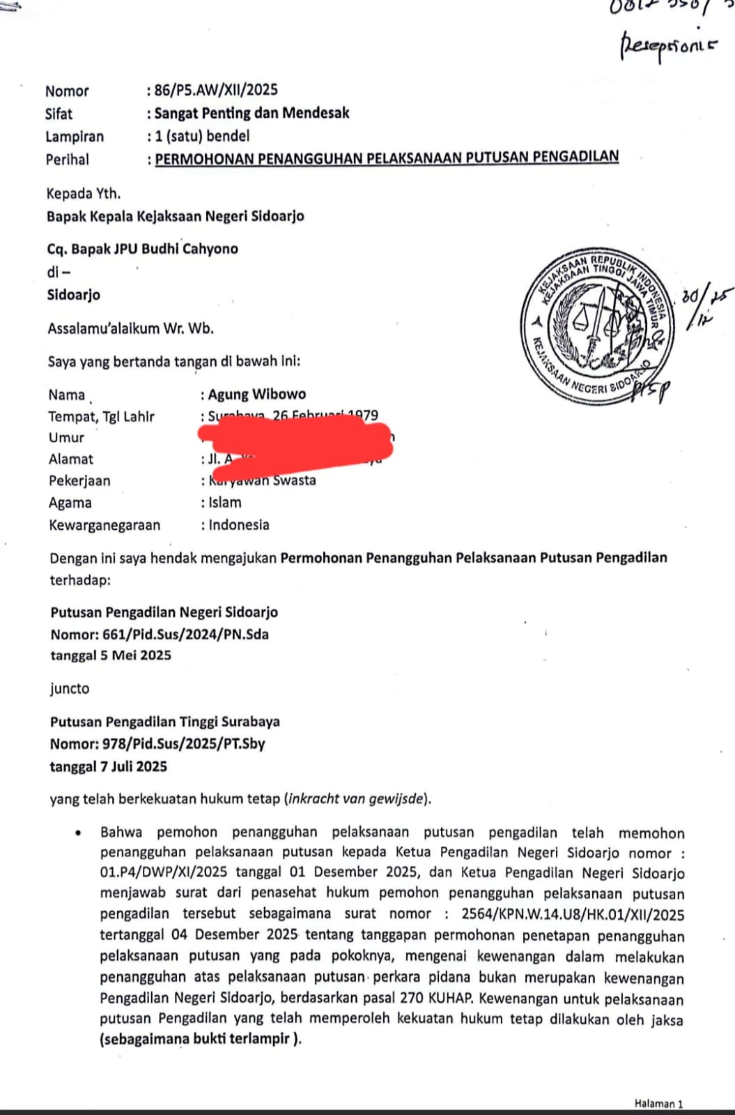 Untuk diketahui, berdasarkan dokumen permohonan, penangguhan pelaksanaan putusan tersebut berkaitan dengan Putusan Pengadilan Negeri Sidoarjo Nomor 661/Pid.Sus/2024/PN.Sda serta Putusan Pengadilan Tinggi Surabaya Nomor 978/Pid.Sus/2025/PT.Sby yang telah inkracht.
